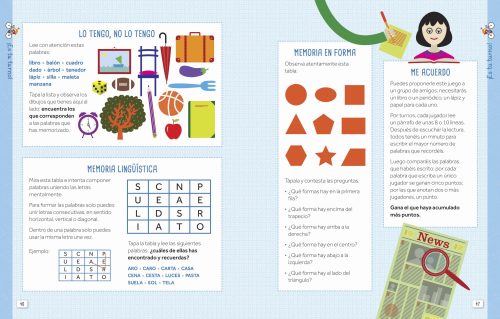 Carlo Carzan y Sonia Scalco, partiendo de la idea de que “el juego es el alimento para la mente”, han dado vida a un manual para niños y niñas ágil y colorido, capaz de implicarlos y estimularlos. Tras una breve introducción que explica cómo funciona el cerebro, los dos entrenadores/autores proponen juegos de distintos géneros, orientados a mejorar la memoria y la concentración, a activar los procesos lógicos de aprendizaje, a desarrollar la creatividad y la imaginación.